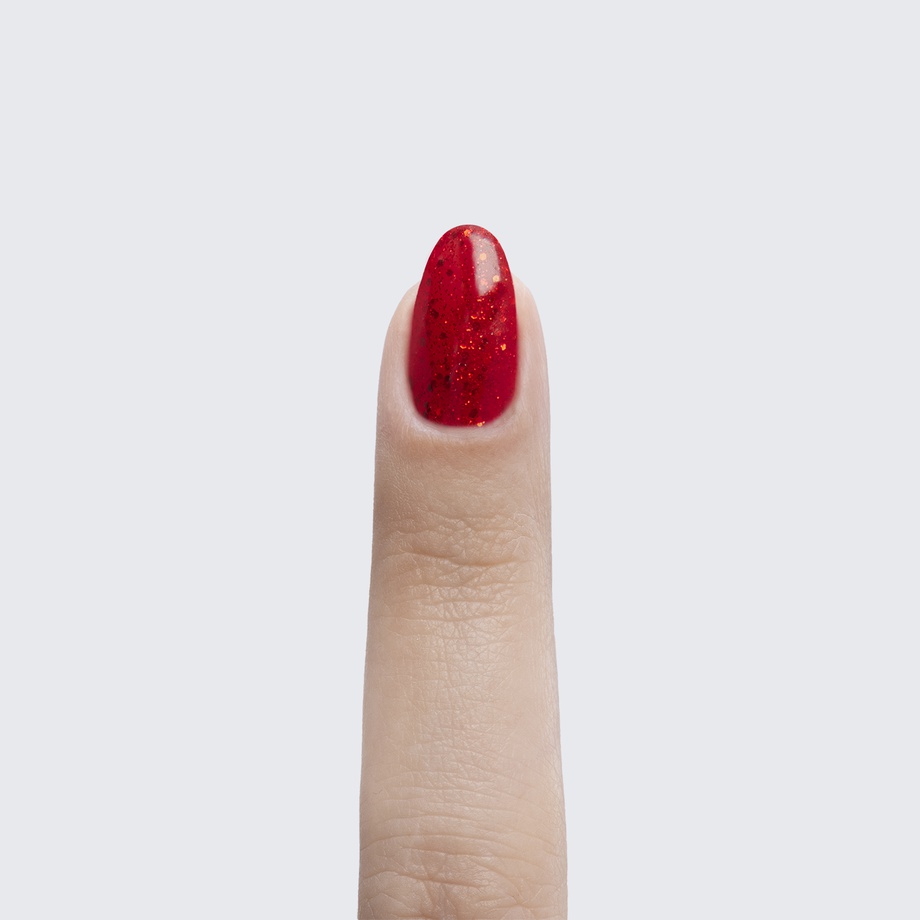 Classic red. Sparkles. Opaque. Cool undertone.